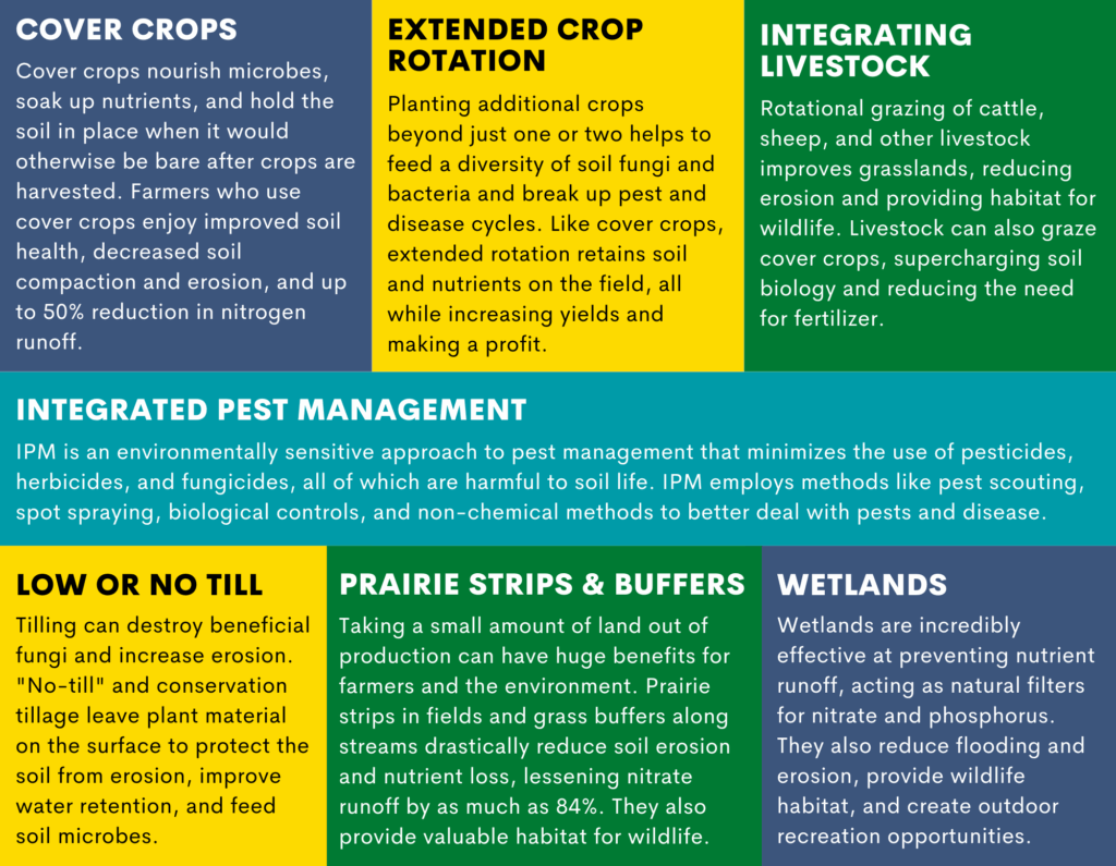 Many solutions that address nutrient pollution focus more on soil than they do water. Soil health and water quality are tightly linked. Healthy soil contains a vibrant underground ecosystem of bacteria, fungi and microbes that help plants to thrive. These organic components create pores in the soil, allowing it to soak up water like a sponge. Soil life suffers when it is plowed, sprayed with herbicides, insecticides and fungicides, fed a steady diet of chemical fertilizer, or limited to just one or two crops. When soil health is threatened, water quality is too.