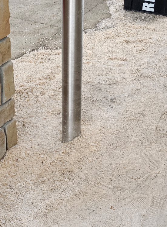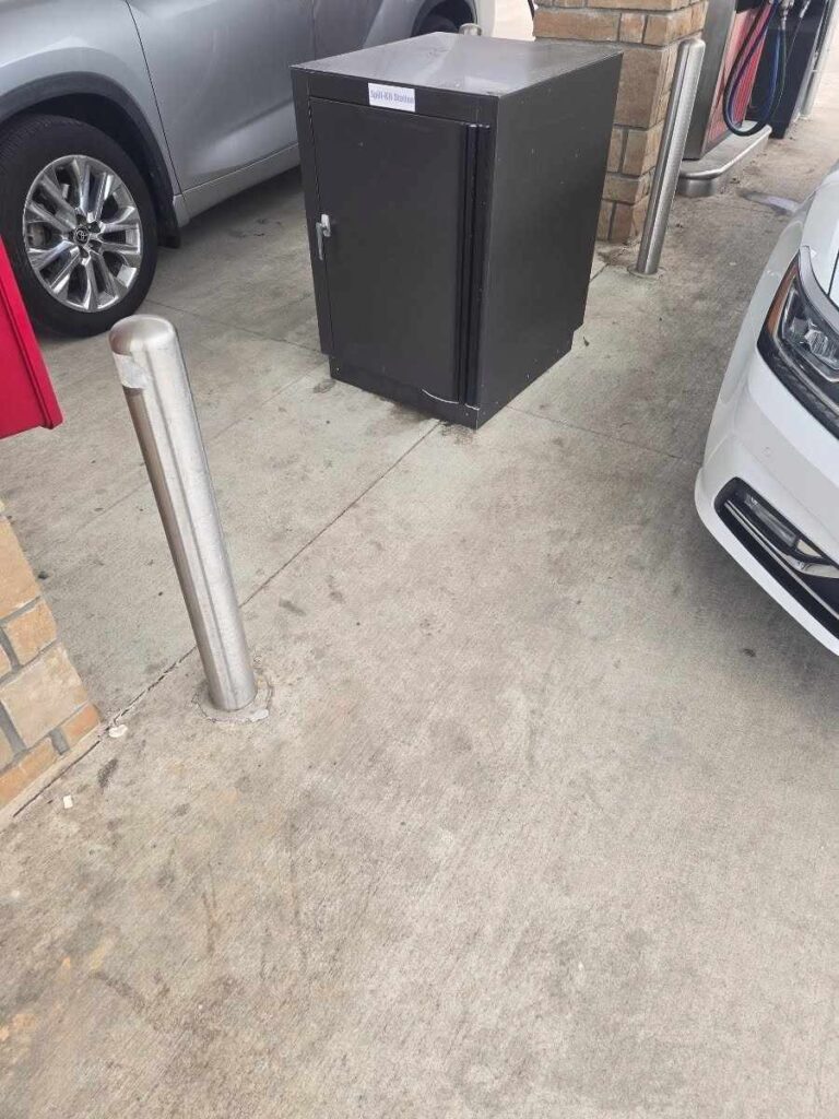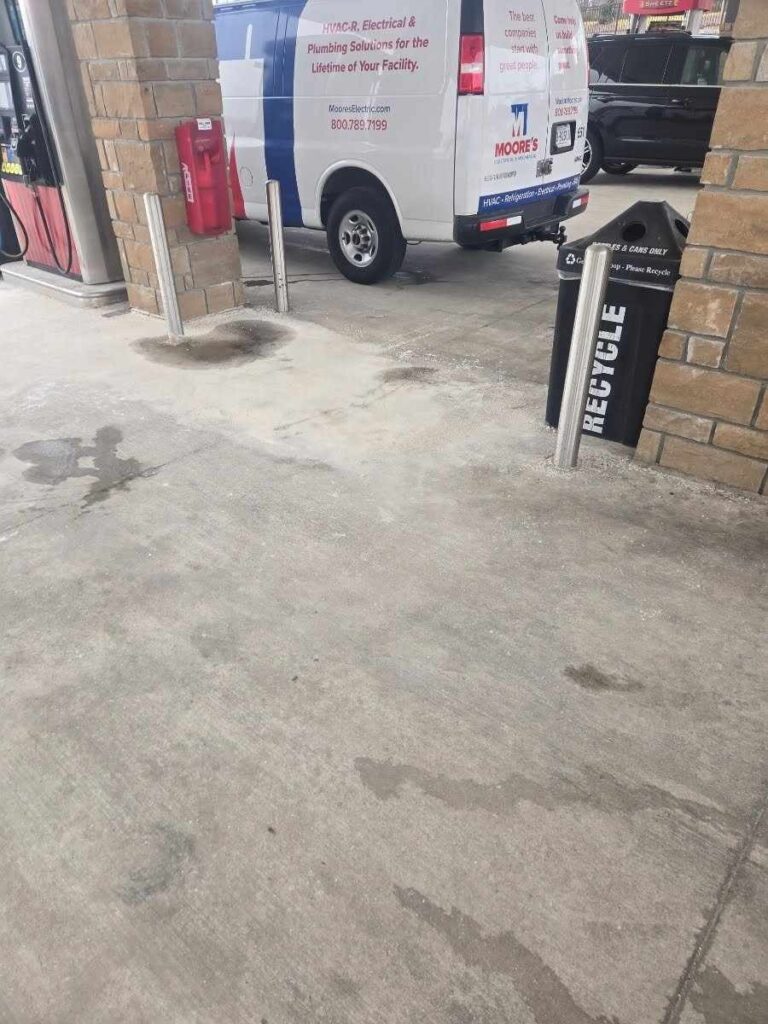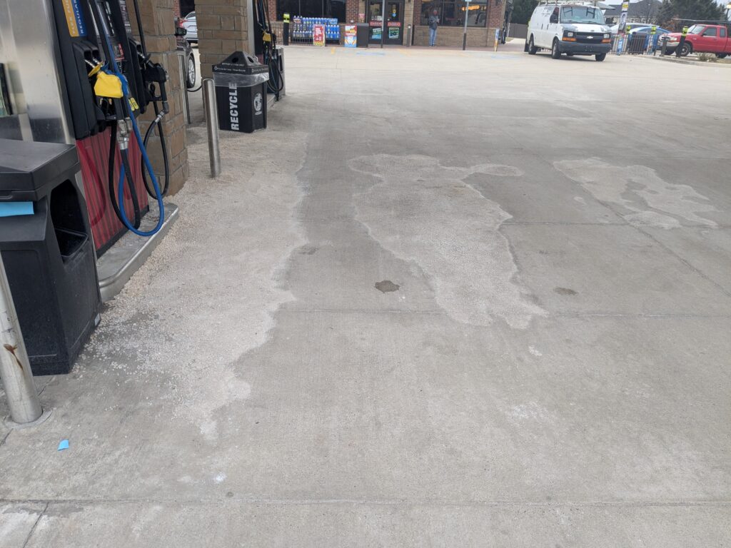 “There were a couple of traffic cones blocking off a small section in the parking lot away from the pumps. A worker in the gas station uniform was scraping another section of the lot, not near the pumps.