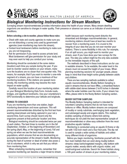 Detailed instructions on conducting Save Our Streams biological monitoring.