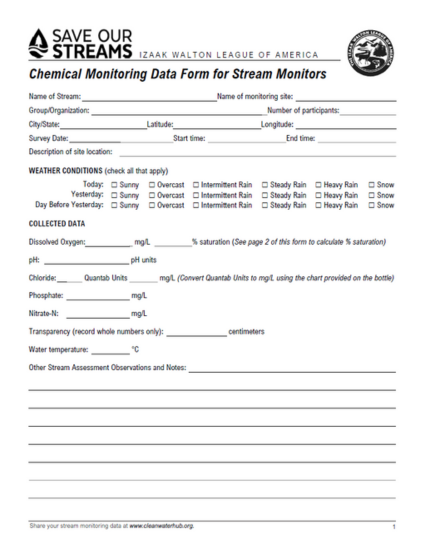 The datasheet to fill out while conducting Save Our Streams chemical monitoring.