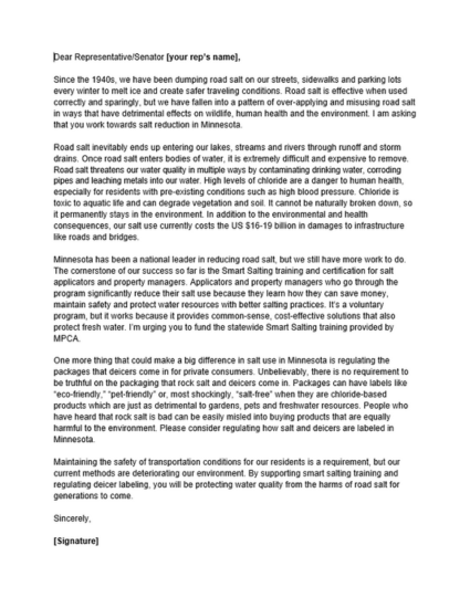 Salt Watch Minnesota Template Letter to Legislators