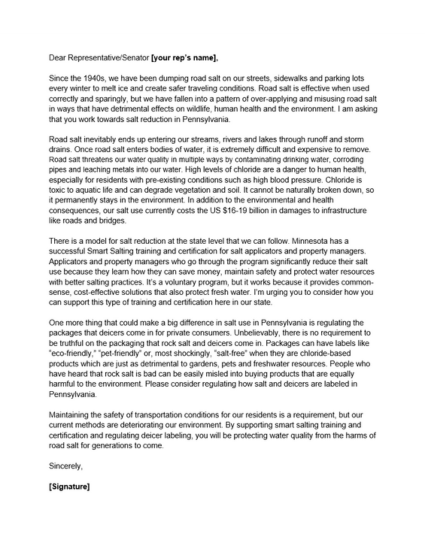 Salt Watch Pennsylvania Template Letter to Legislators