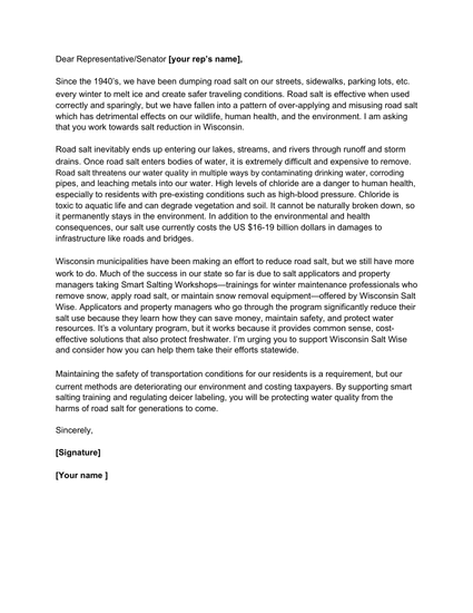 A template letter to write to your representatives in Wisconsin in support of salt reduction and smarter salt use in your community.