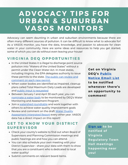 Ideas and resources to help VA SOS monitors advocate for clean water in suburban and urban areas.