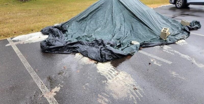 This parking lot was close to a stream. Over the years, the stream had flooded many times, often inflicting damage on the building. Even if this upcoming weather event wasn’t extreme, I could imagine the impact of these large storage piles being inundated by rain and washing into the nearby watershed and creek. I contacted Wissahickon Trails, a nonprofit that protects waterways upstream of Philadelphia, and had a good discussion. I then called the Pennsylvania Department of Environmental Protection (PA DEP) to report the situation. A few days later, I noticed that the piles were mostly covered with blue tarps. How much salt washed out from underneath the tarps? I don’t know, but a white trail of salt deposits suggested that the answer was “more than none.”