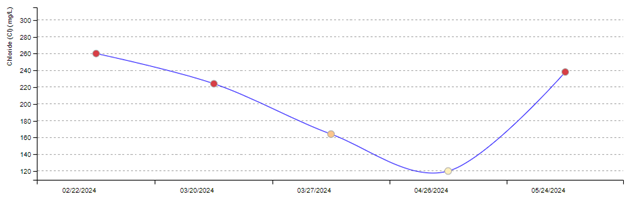 In Cleveland, Ohio, in May 2024, we are seeing just that—elevated levels of chloride pollution persisting through the spring at most of the sites monitored by Cleveland Metroparks (you can see more of the monitoring results below for some of the sites).