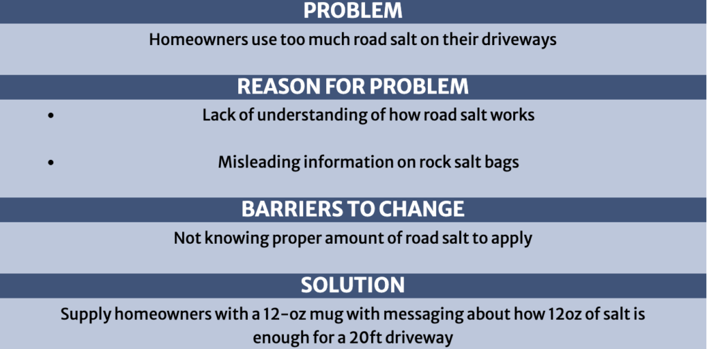 When creating a goal, be as specific as possible and make sure the goal is measurable. For this example, we need to understand first how much road salt the average homeowner is using, the reasons why most people use too much and the barriers that are preventing them from changing their behavior. Once we take measure of the issue at hand and ask questions about the problem, we can then come up with an amenable solution to incite behavior change.