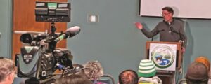 Top photo: Scott Kovarovics talks about the League’s work to reduce chloride pollution. City of Gaithersburg, Md. employees who work on snow removal and salt application (in yellow overcoats) were among the Salt Awareness Week participants. Credit: Michael Reinemer.